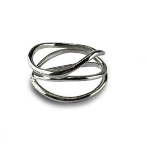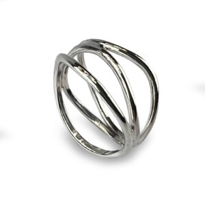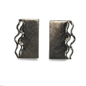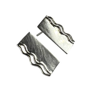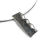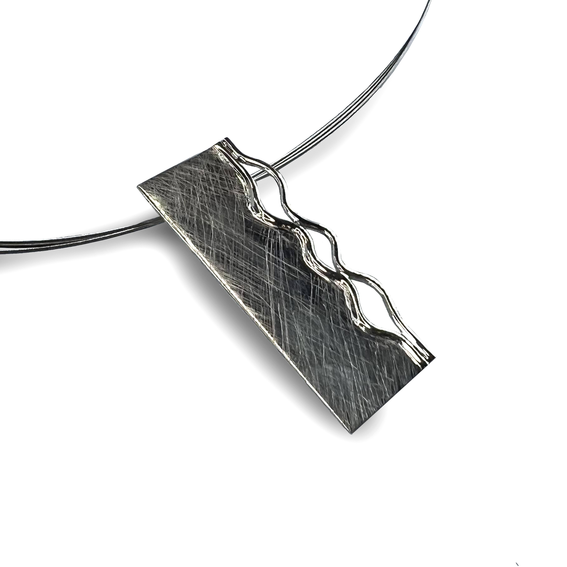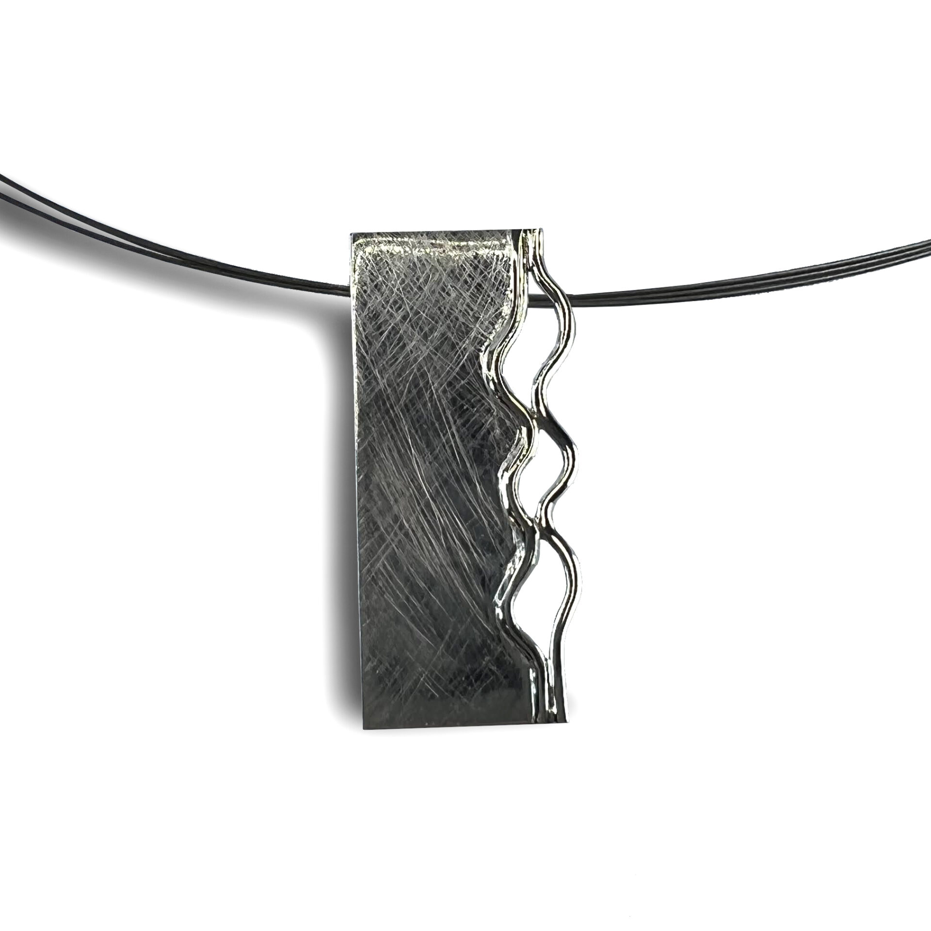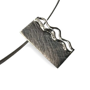 Penjoll de plata en forma de rectangle d’uns 1.6 x 4.3cm. amb doble ona de fil rodo en un lateral. Cordó no inclós.