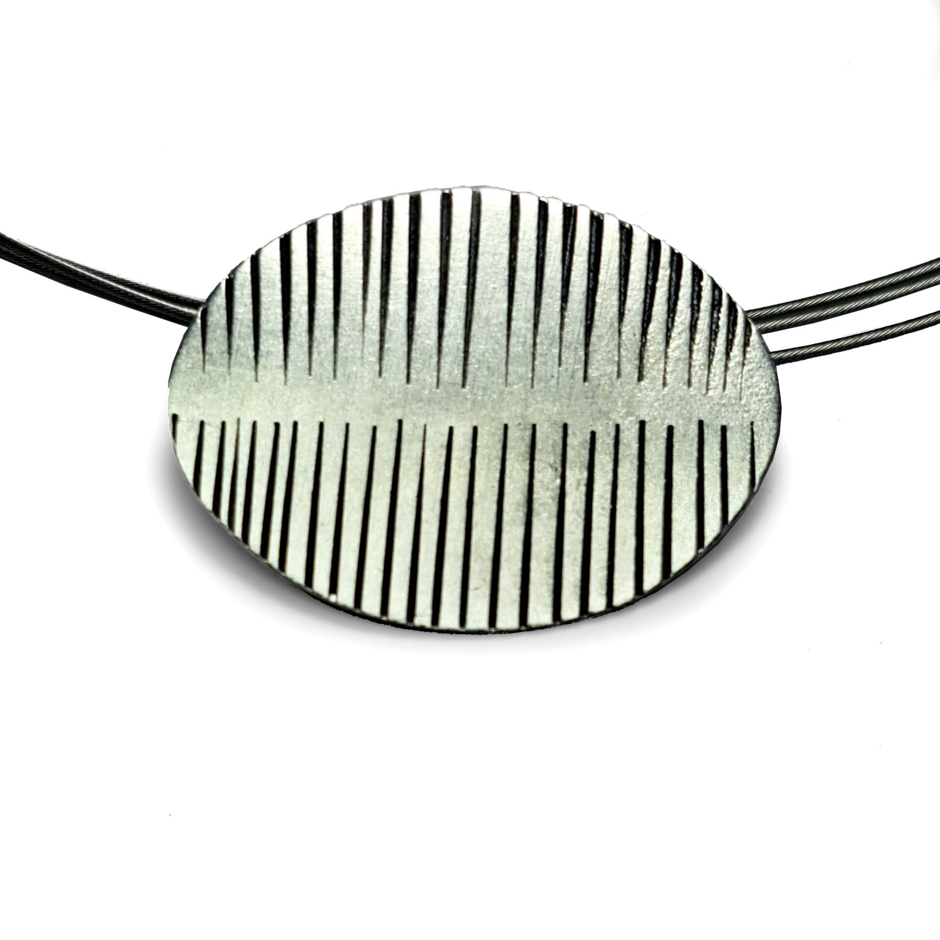 Penjoll de la col.lecció Poppy, format per planxa de plata en forma de peça ovalada d’uns 2.6x2cm amb lineas grabades i ennegrides. Cordó no inclós.