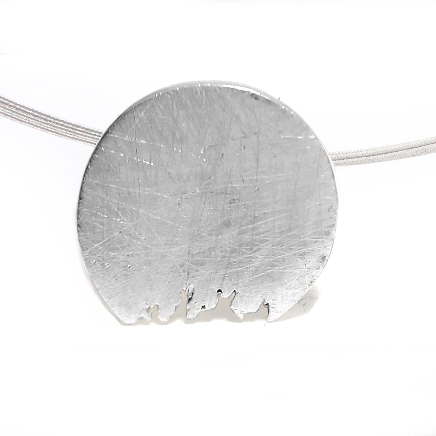 Penjoll de plata, d’uns 1,2 cm. de diàmetre, en forma de rodona amb mosegada. Acabat mate ratllat o polit. Cordó no inclós.