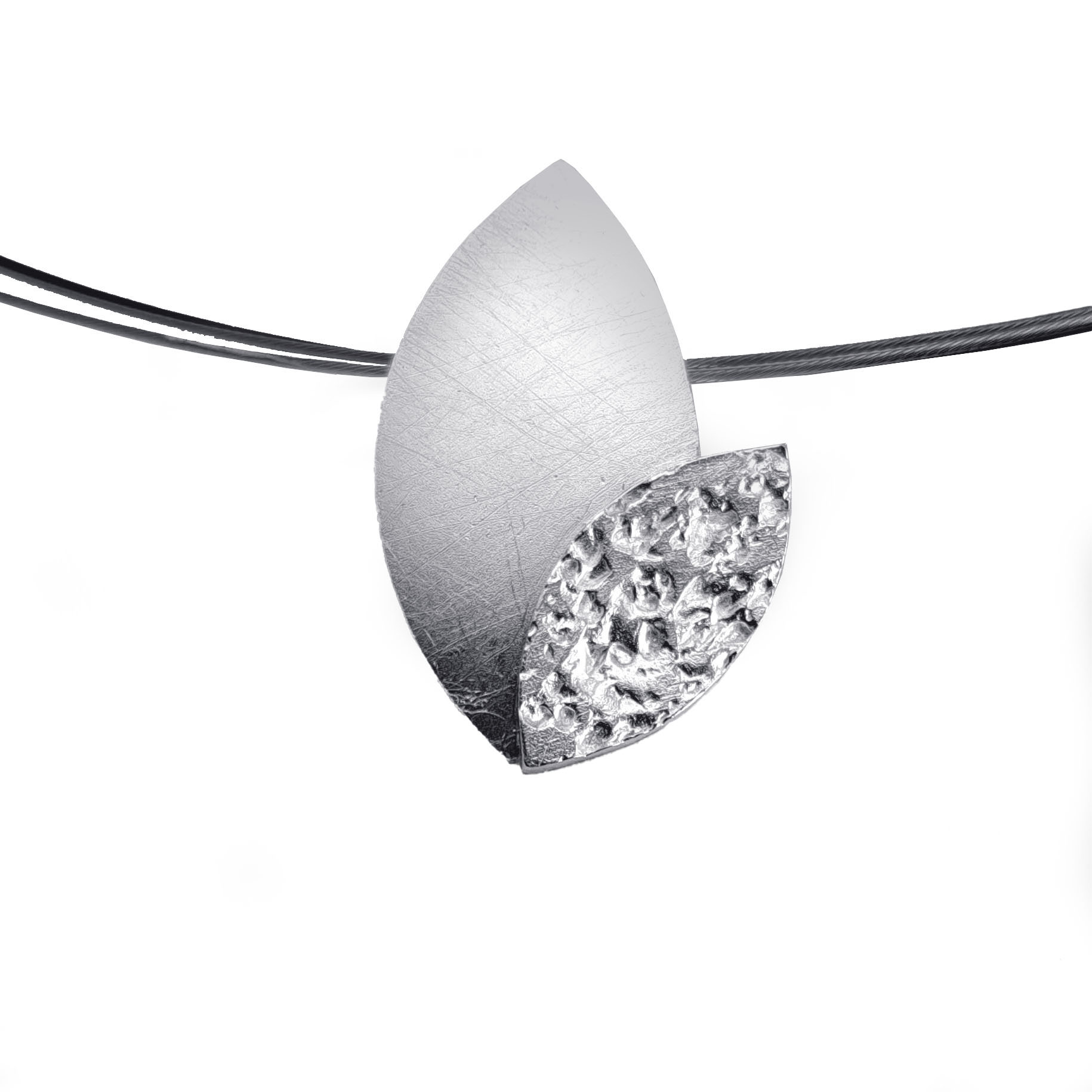 Penjoll de la col.lecció LOTO, format per fulla de plata lliça d’uns 2.6×1.4cm. i fulla de plata rugosa d’uns 1.7×0.9cm. Cordó no inclós.