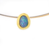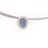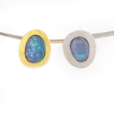 Penjoll de plata amb forma ovalada irregular d’uns 1.1cm. x 0.9cm. Amb o sense, en la part superior, planxa d’or de 24kts. Kumm Boo, i òpal. Cordó no inclós.