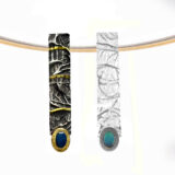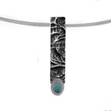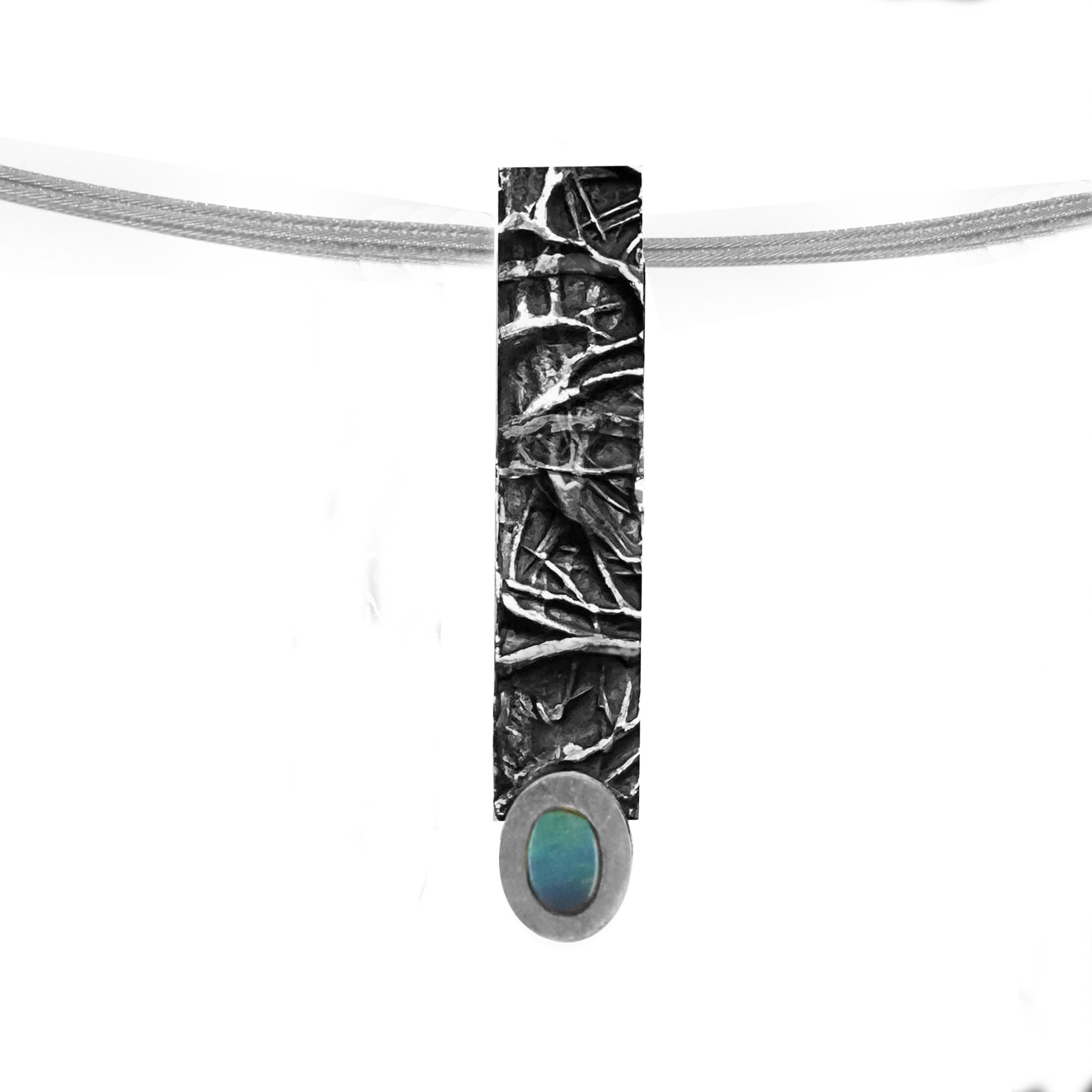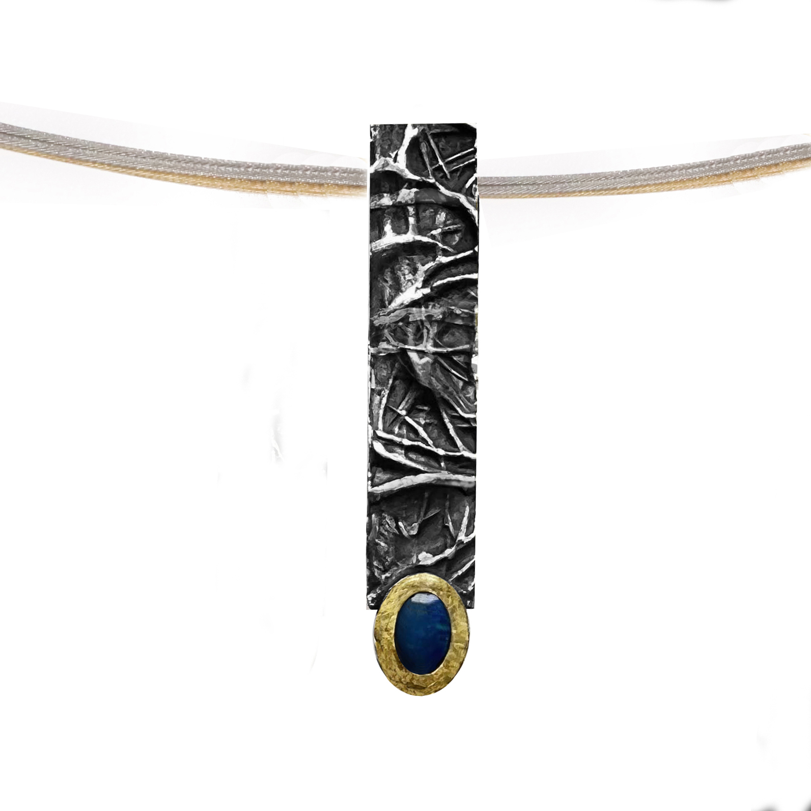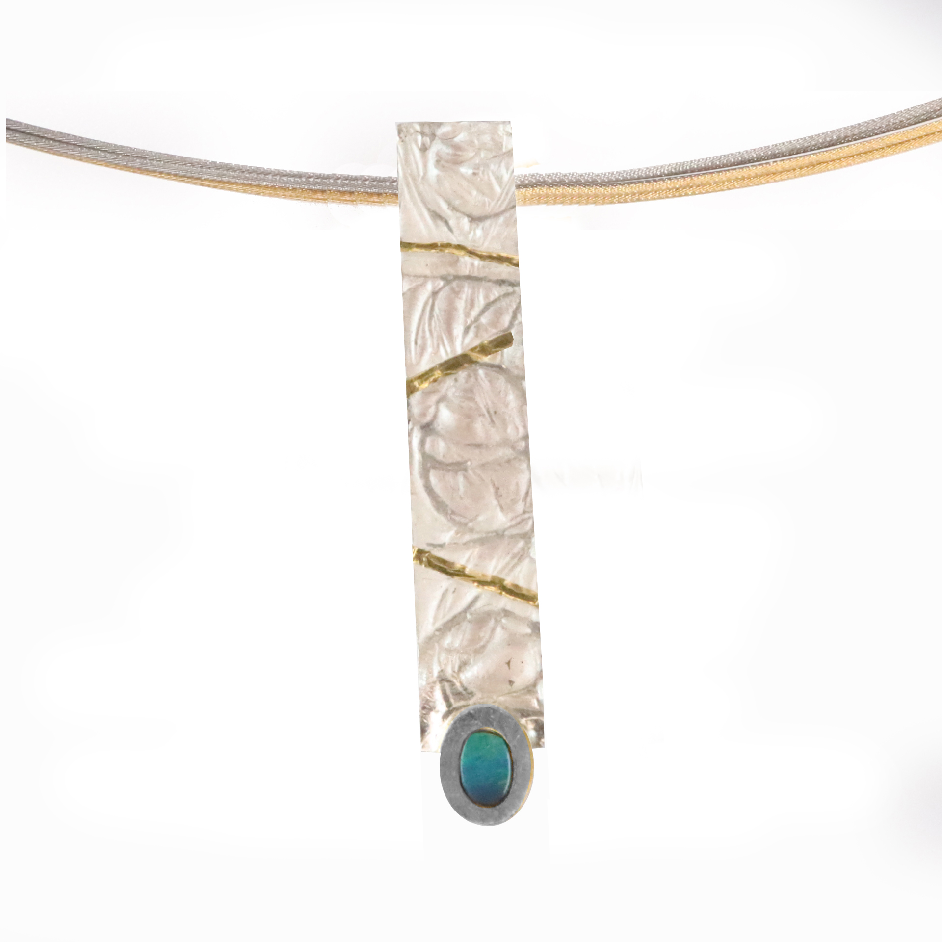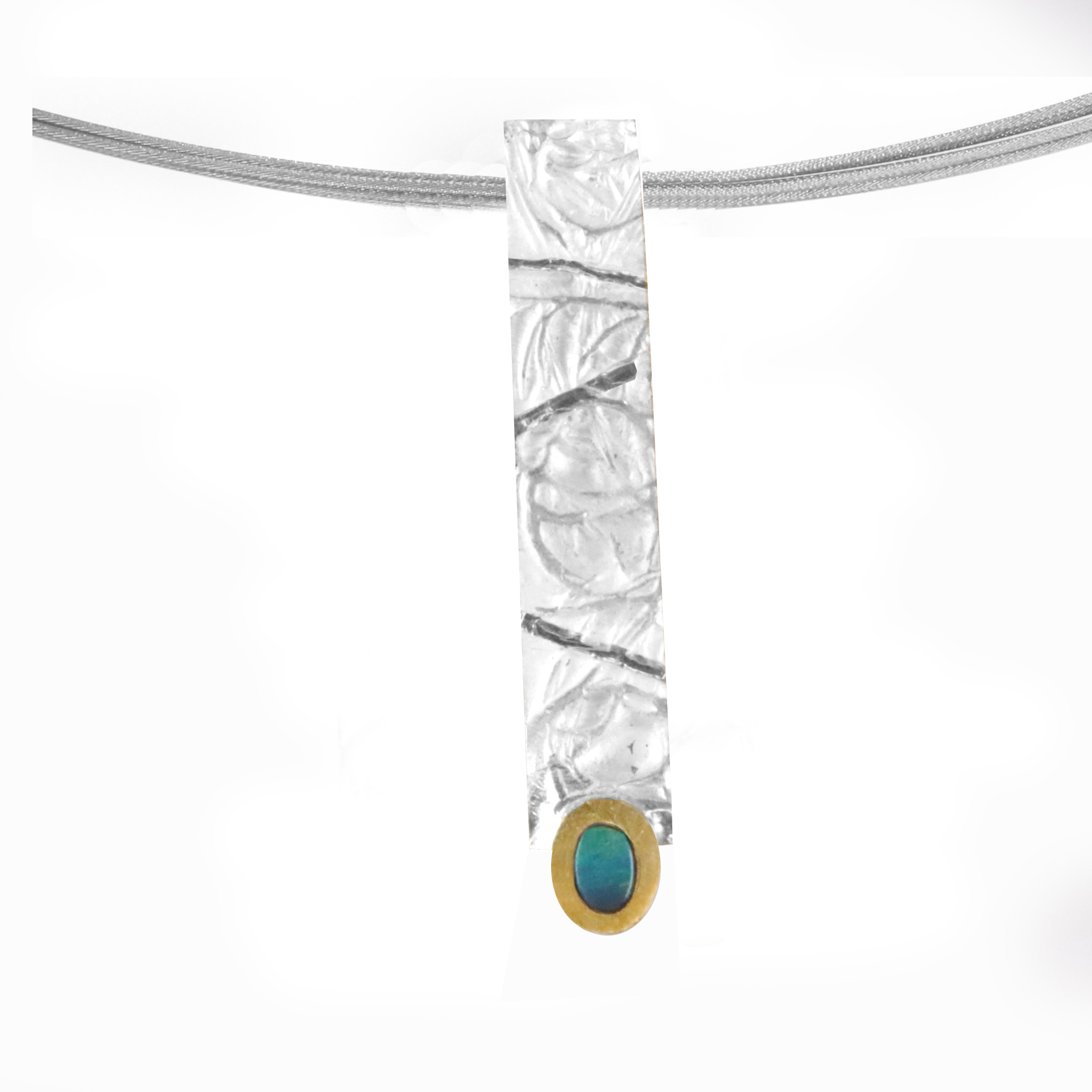 Penjoll de plata amb forma rectangle d’uns 4.2 x 0.8cm. de planxa texturada amb fils, amb o sense tocs d’or, i en la part inferior, boca amb o sense or 24 kts ( Kum boo) i òpal d’uns 0.5 x 0.3 cm. Cordó no inclós.