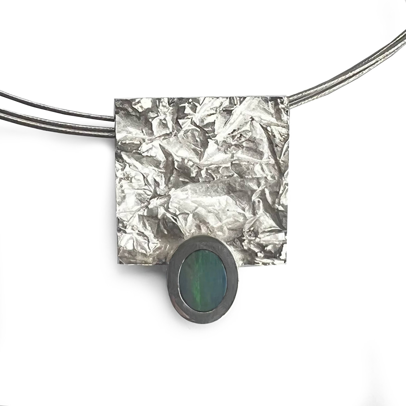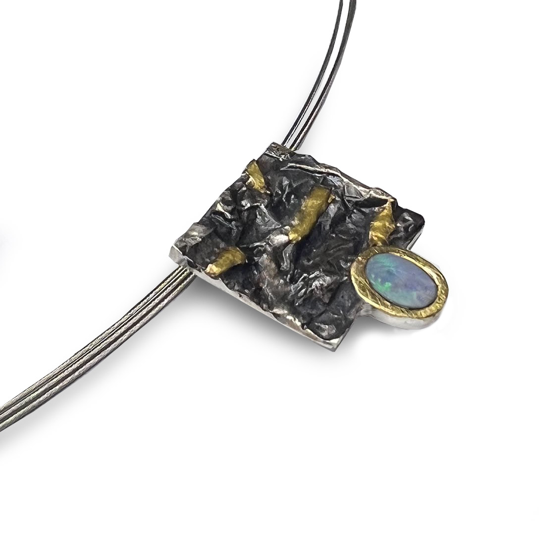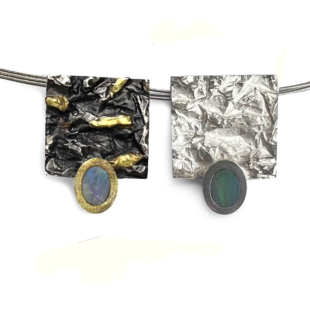 Penjoll de plata ennegrida amb forma de rectangle amb textura muntanyosa d’uns 1.5 cm x 1.5cm ,amb o sense tocs i/o boca d’or de 24 kilats i òpal d’uns 0.6x 0.4cm. Cordó no inclós.