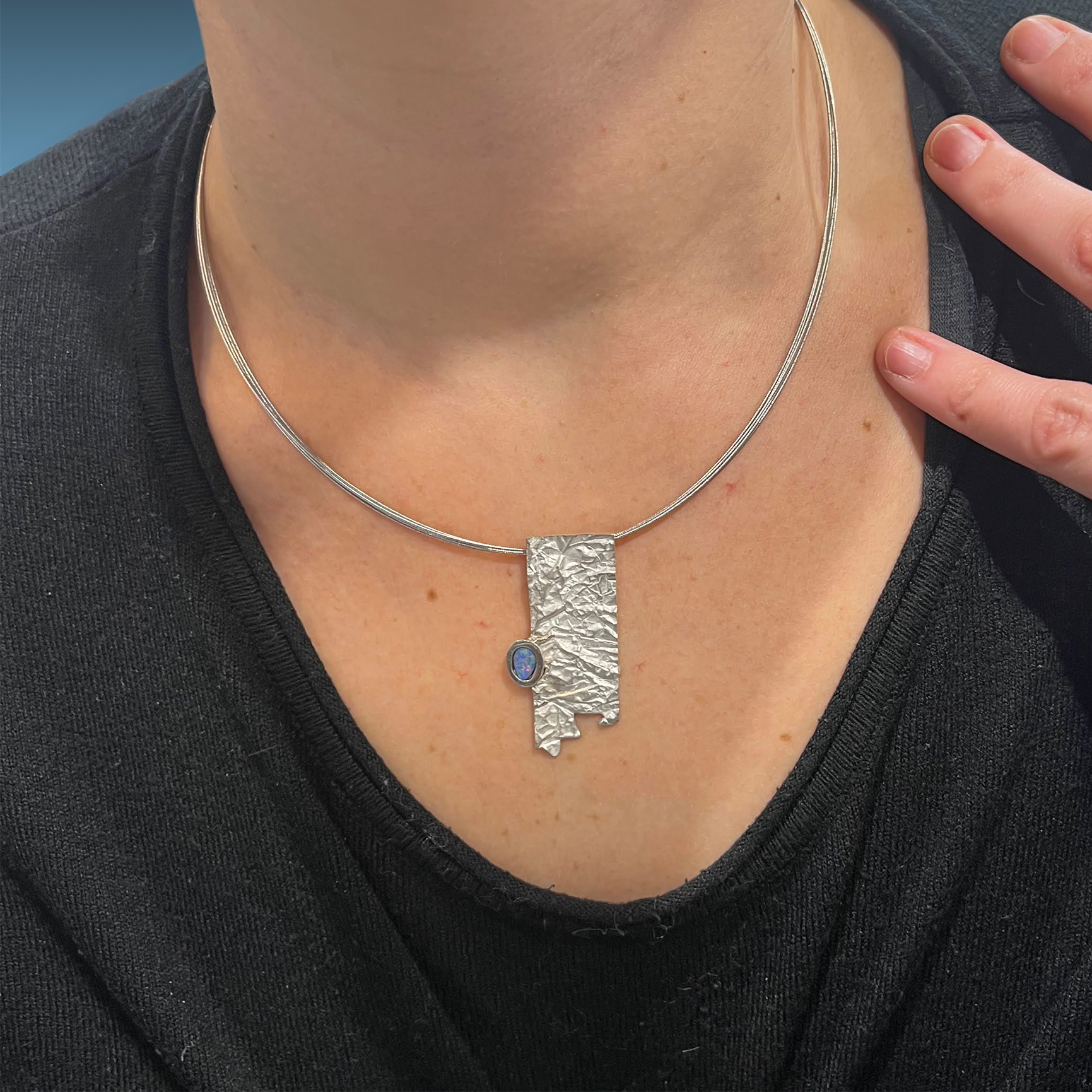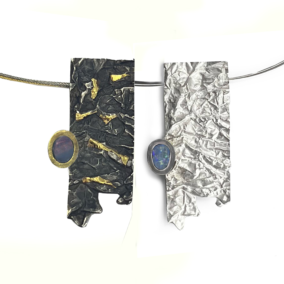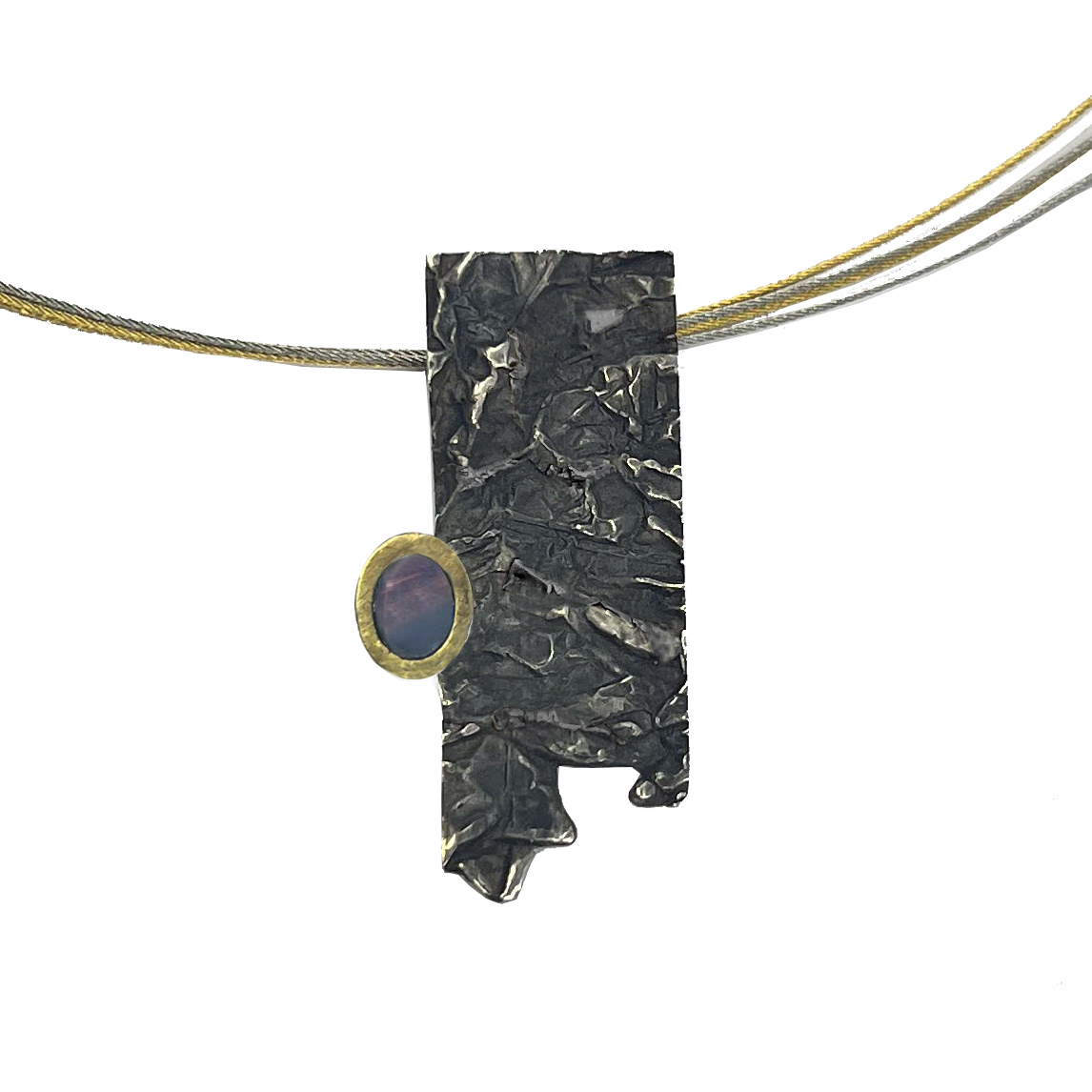 Penjoll de plata amb forma de rectangle amb textura muntanyosa d’uns 3.5 cm x 1.5cm , amb o sense tocs d’or de 24 kilats i boca ovalada de plata amb o sense or de 24 kilats ( Koom Buu) amb òpal d’uns 0.6x 0.4cm. Cordó no inclós.