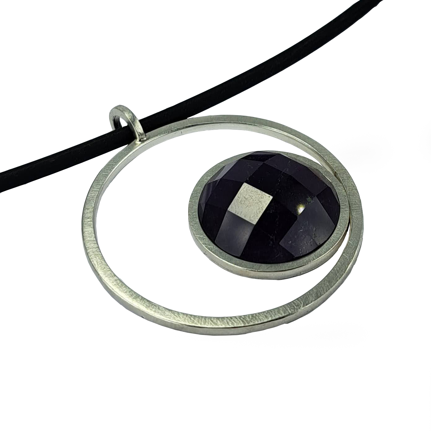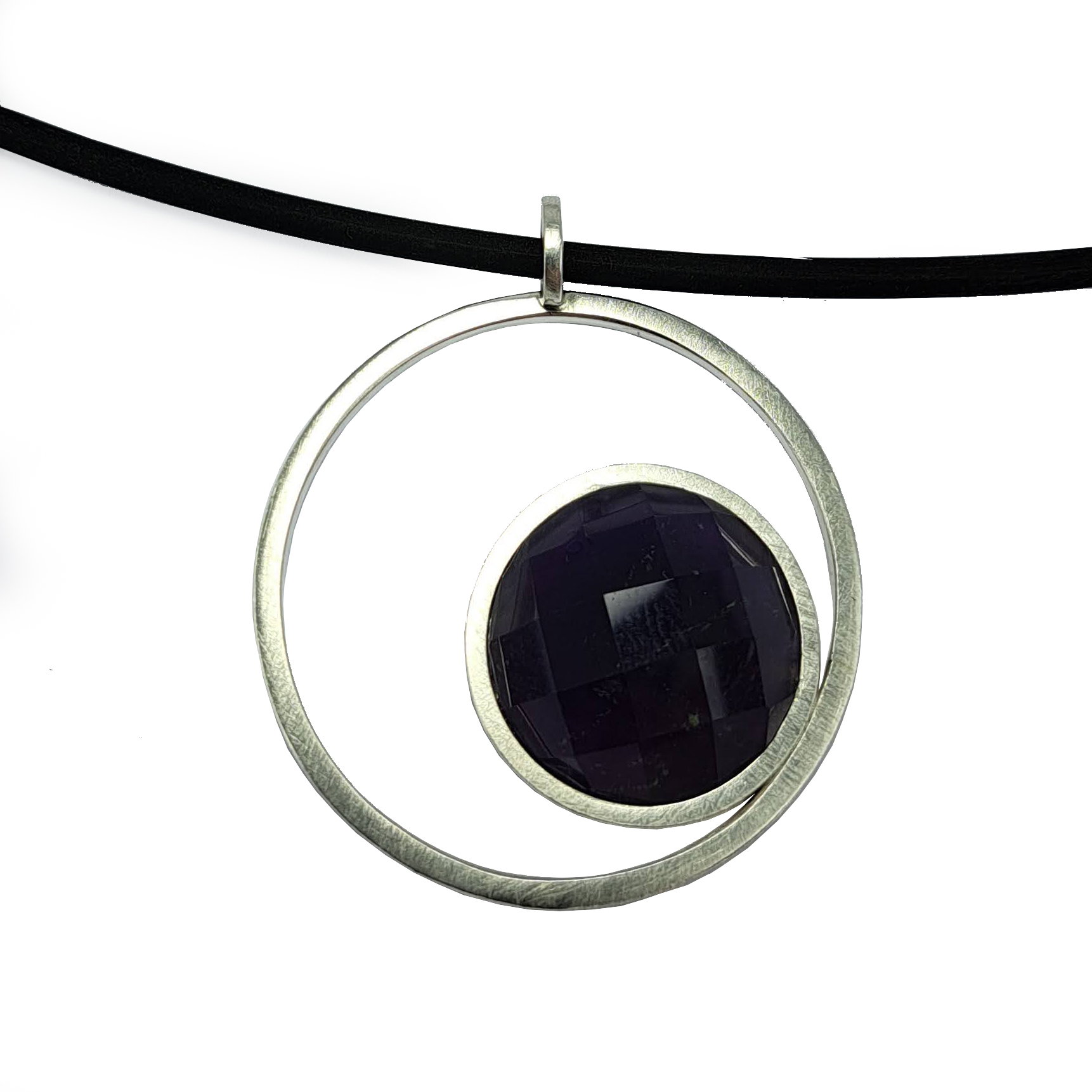 Penjoll de la col.lecció Petri , Amatista en forma de rodona amb la part superior facetada d’uns 2.cm., amb marc de fil cuadrat de plata i rodona mes gran tambe amb fil quadrat d’uns 2x2mm. Cadena no