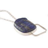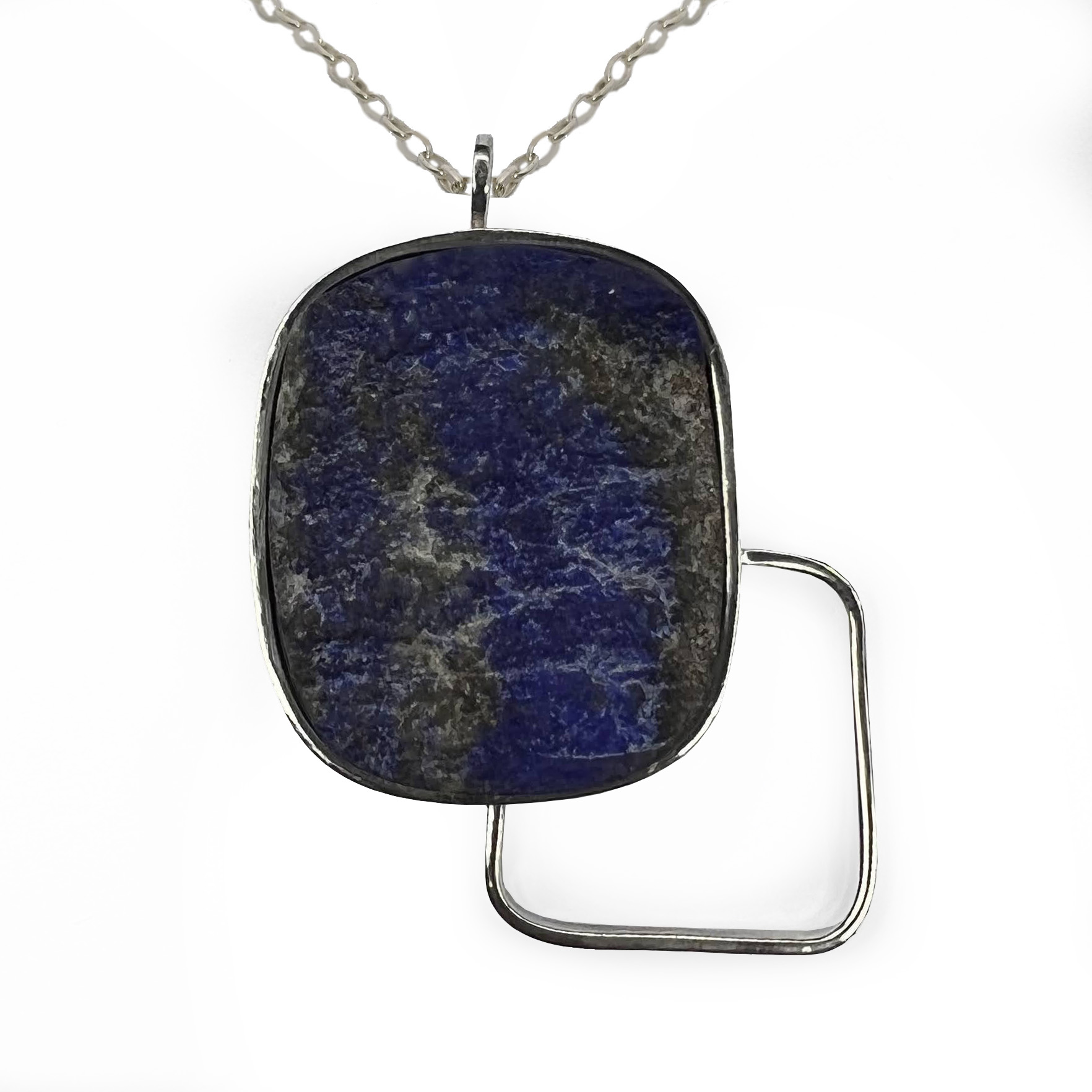 Penjoll de la col.lecció Petri , Lapislazuli en forma de quadrat cantos arrodonits d’uns 3.3 x 2.8 cm., amb fil cuadrat de plata tot al voltant mes part d’un marc quadrat en la part exterior inferior. Cadena no inclósa.