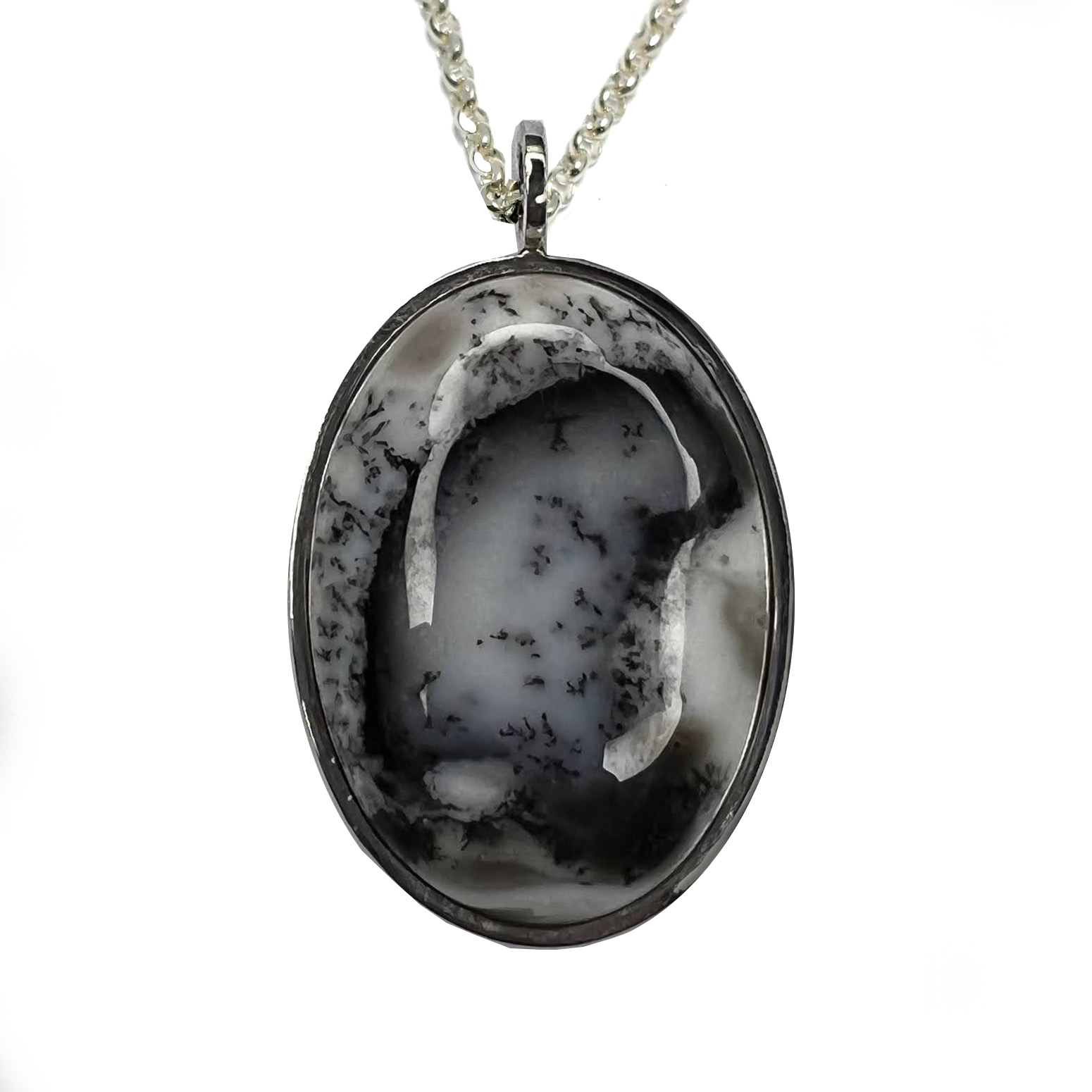 Penjoll de la col·lecció Petri, Òpal dendrític en forma ovalada d’uns 3.1 x 2.3 cm., amb fil quadrat de plata al voltant. Cadena no inclosa.