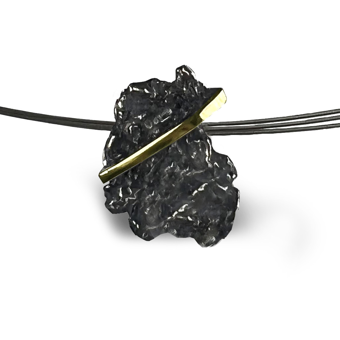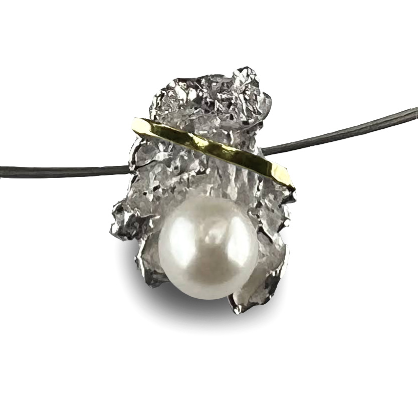 Penjoll de plata, d’uns 2 cm. d’alçada, en forma de textura refossa, en plata blanca o ennegrida i parts brillants, tira d’or brillant inclinada, amb perla o sense. Cordó no inclós.