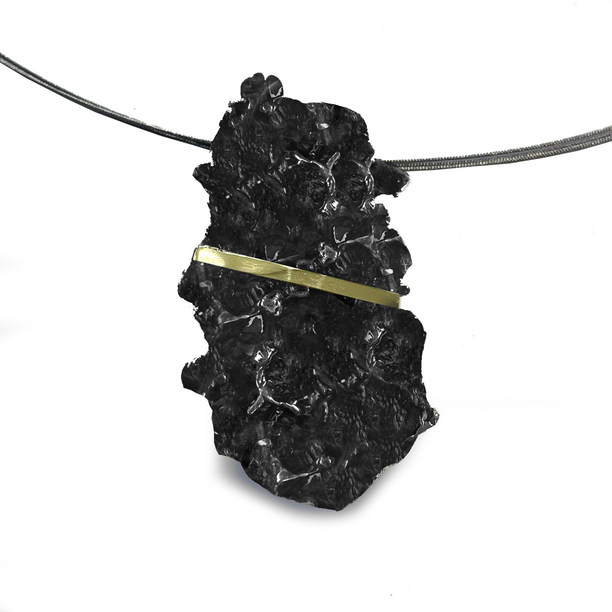Penjoll de plata, d’uns 5 cm. d’alçada, en forma de textura refossa, en plata blanca o ennegrida i parts brillants, tira d’or brillant inclinada, amb perla o sense. Cordó no inclós.