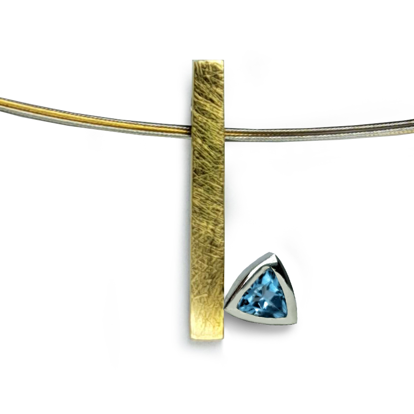 Penjoll de la col.lecció Lili, format per rectangle d’uns 2,2×0.25cm de plata amb la part superior amb una làmina d’or groc i iboca en forma triangular amb pedra de 5x5x5mm.