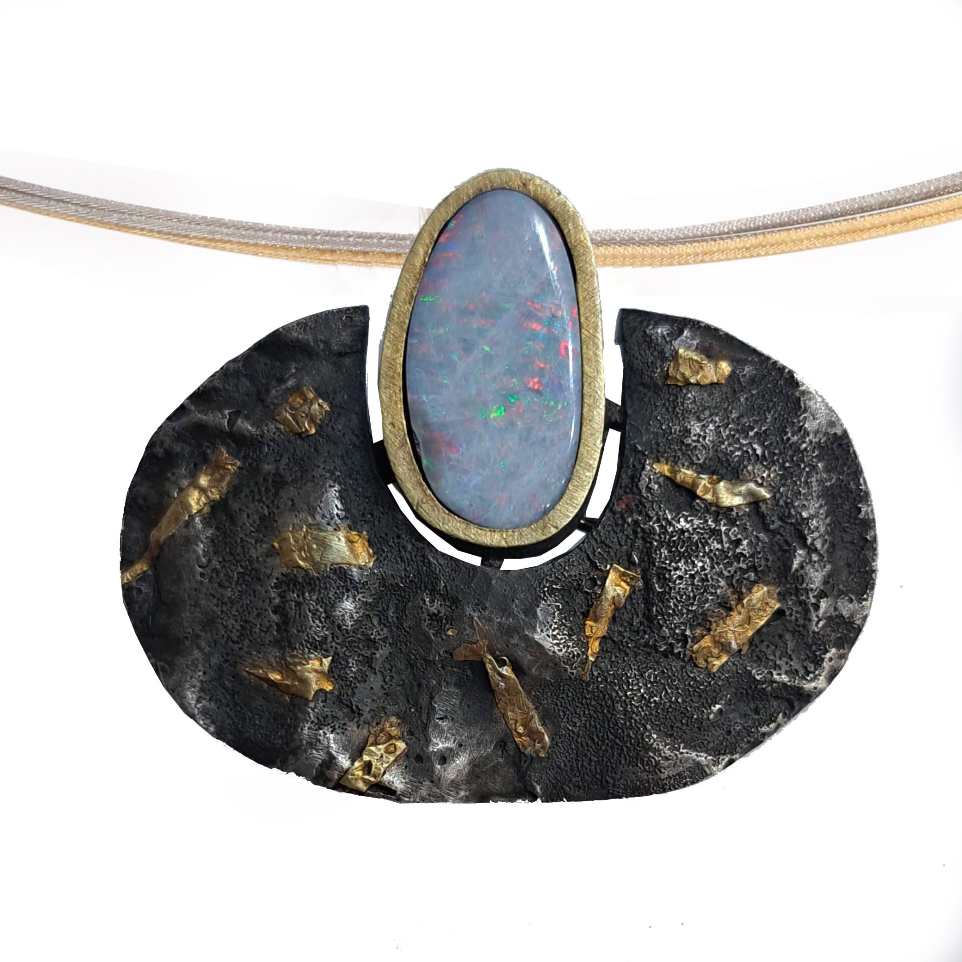 Penjoll de plata amb textura rocosa en forma ovalada d’uns 3’7×2’4cm. amb lines d’or de 24kts, Kum Boo. Boca de plata amb part superior lamina d’or de 24 kts, Kum Boo, i òpal ovalat d’uns 1.6. x 0