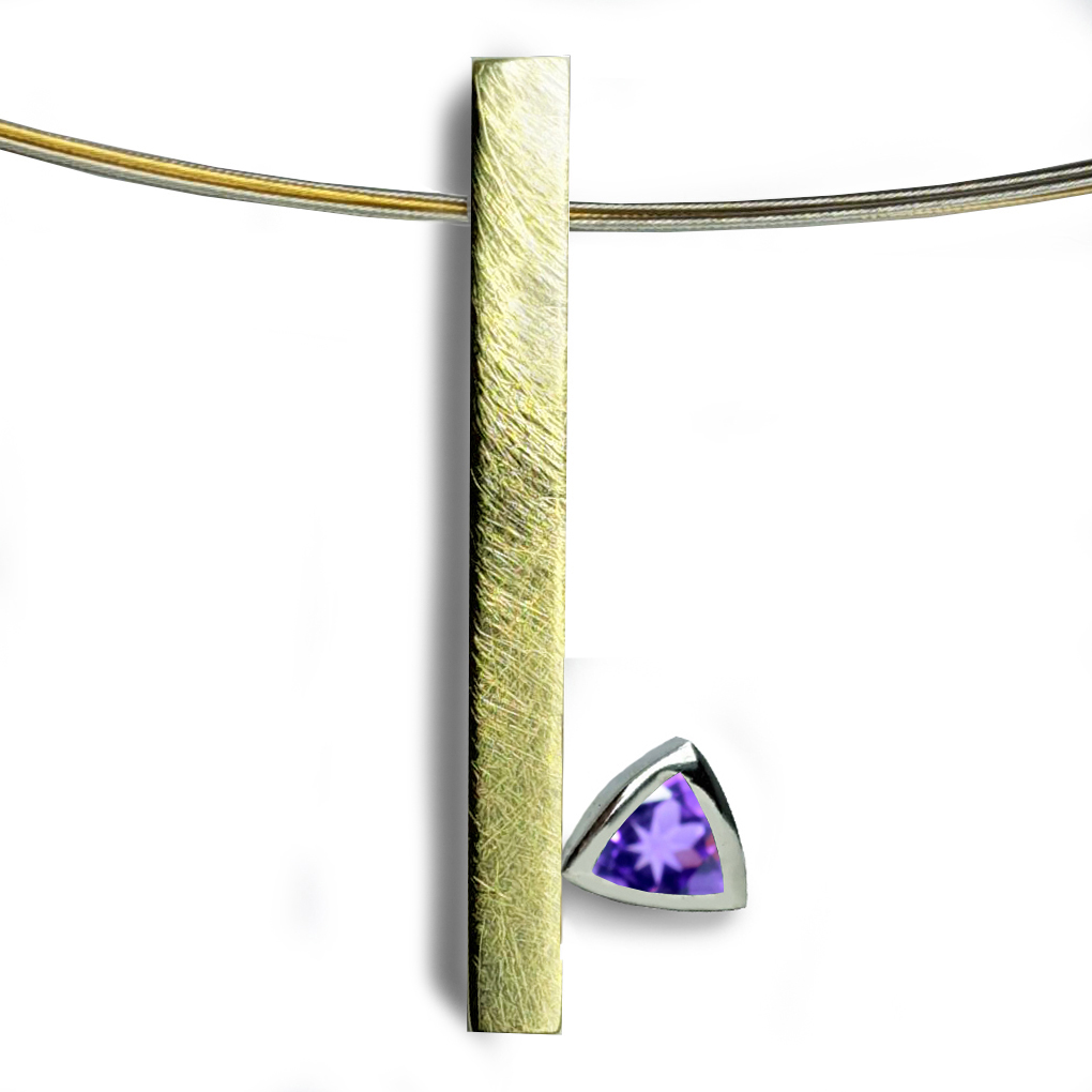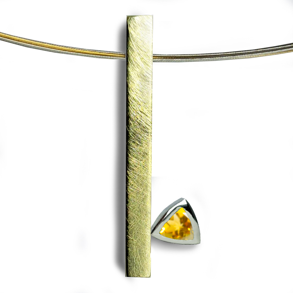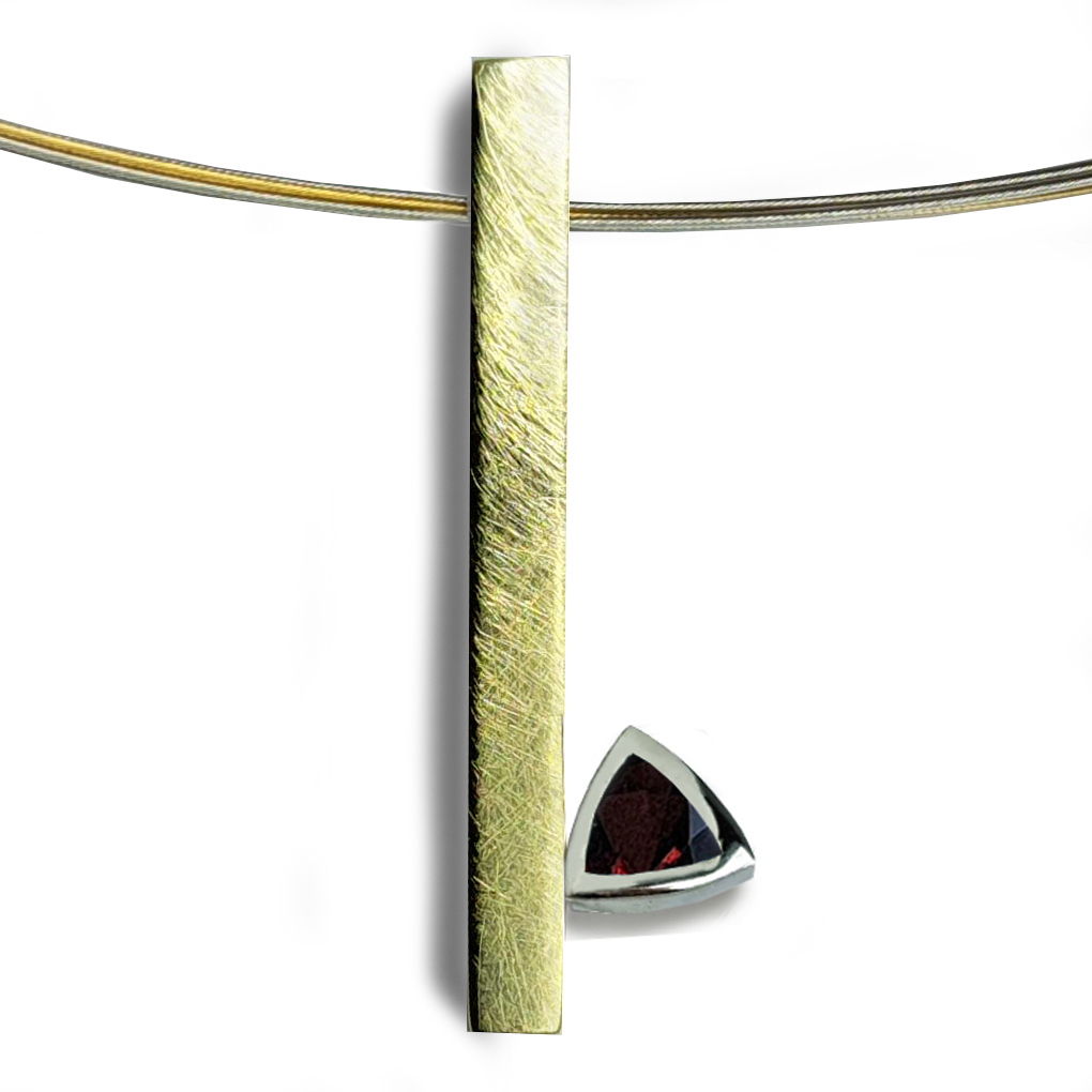 Penjoll de la col.lecció Lili, format per rectangle d’uns 3×0.3cm de plata amb la part superior amb una làmina d’or groc, i en un costat, boca triangular ( Delta ) de plata amb pedrai de 5x5x5.