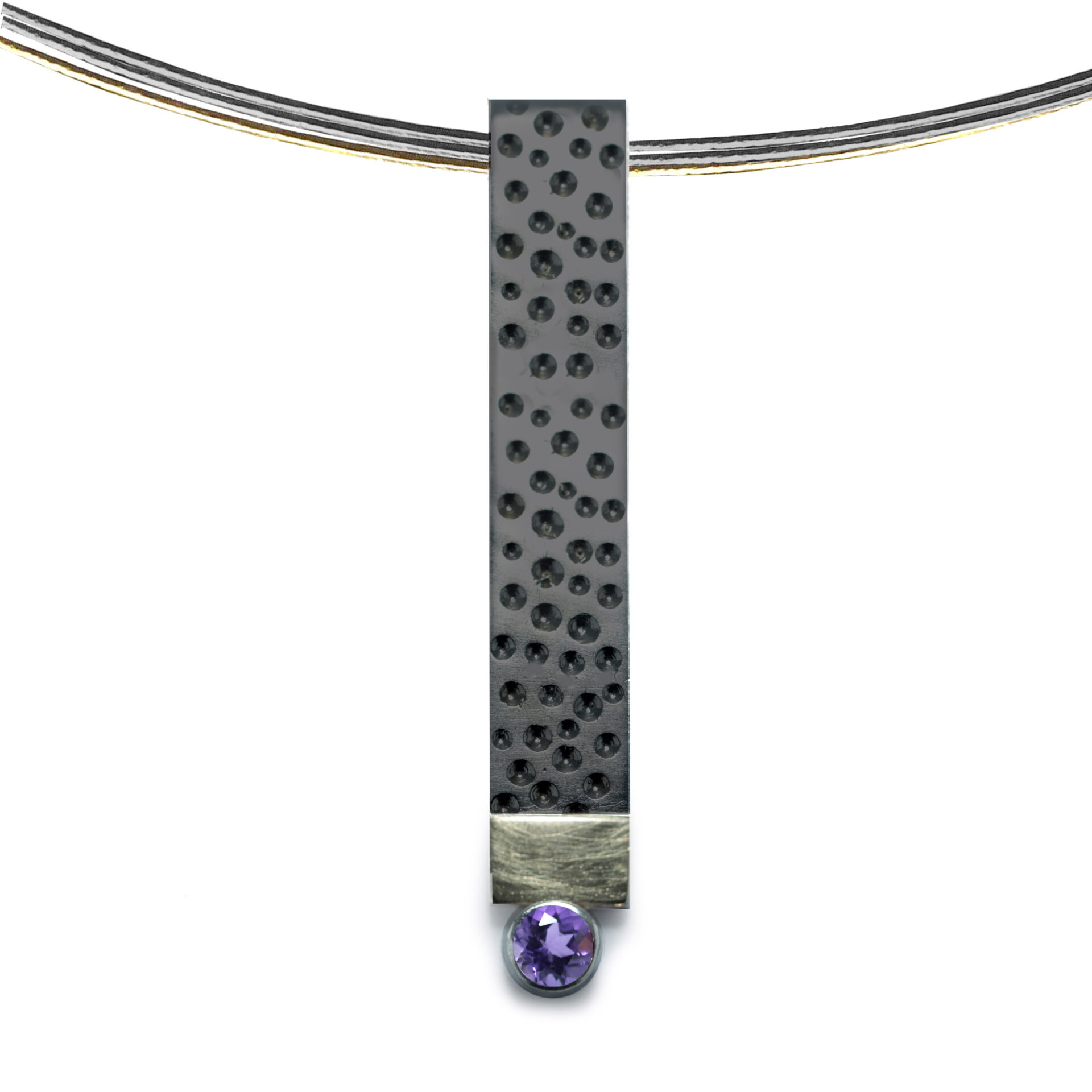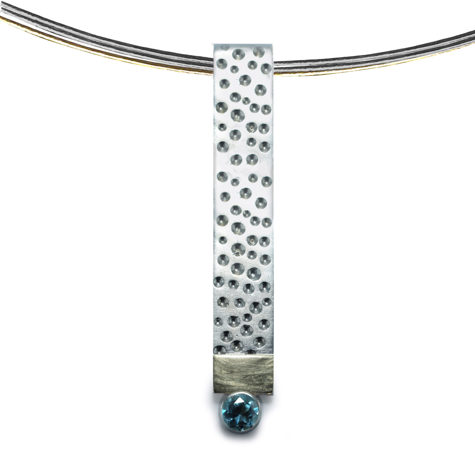 Penjoll de plata en forma de rectangle vertical d’uns 0.7 x 4.5 cm d’amplada, amb acabat amb punts. En la part inferior , linea d’or groc de 18 kts mate ratllada, i boca amb pedra de 4mm de diametre. Cordó no inclós.