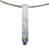 Penjoll de plata en forma de rectangle vertical d’uns 0.7 x 4.5 cm d’amplada, amb acabat amb ratlles. En la part inferior , linea d’or groc de 18 kts mate ratllada, i boca amb pedra de 4mm de diametre
