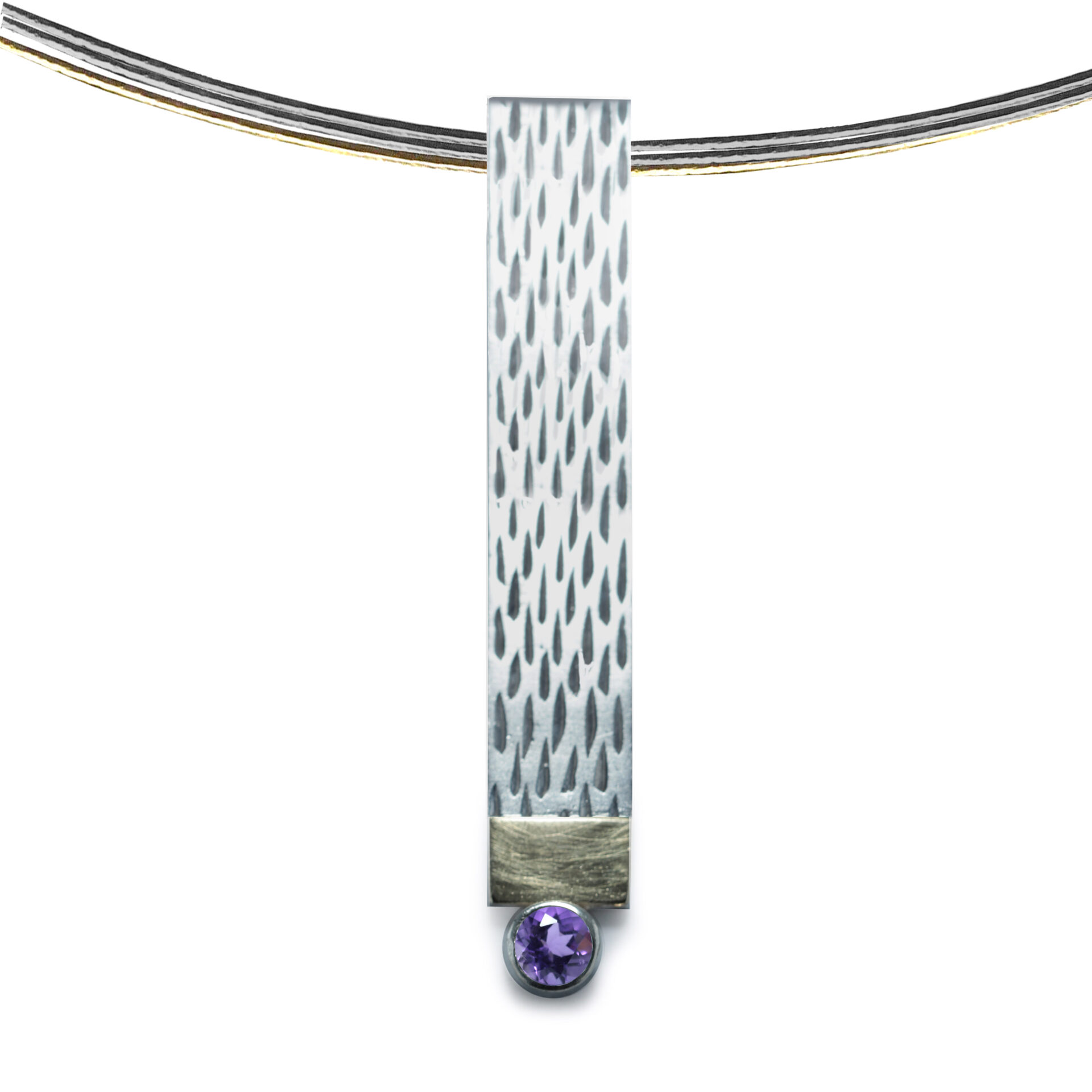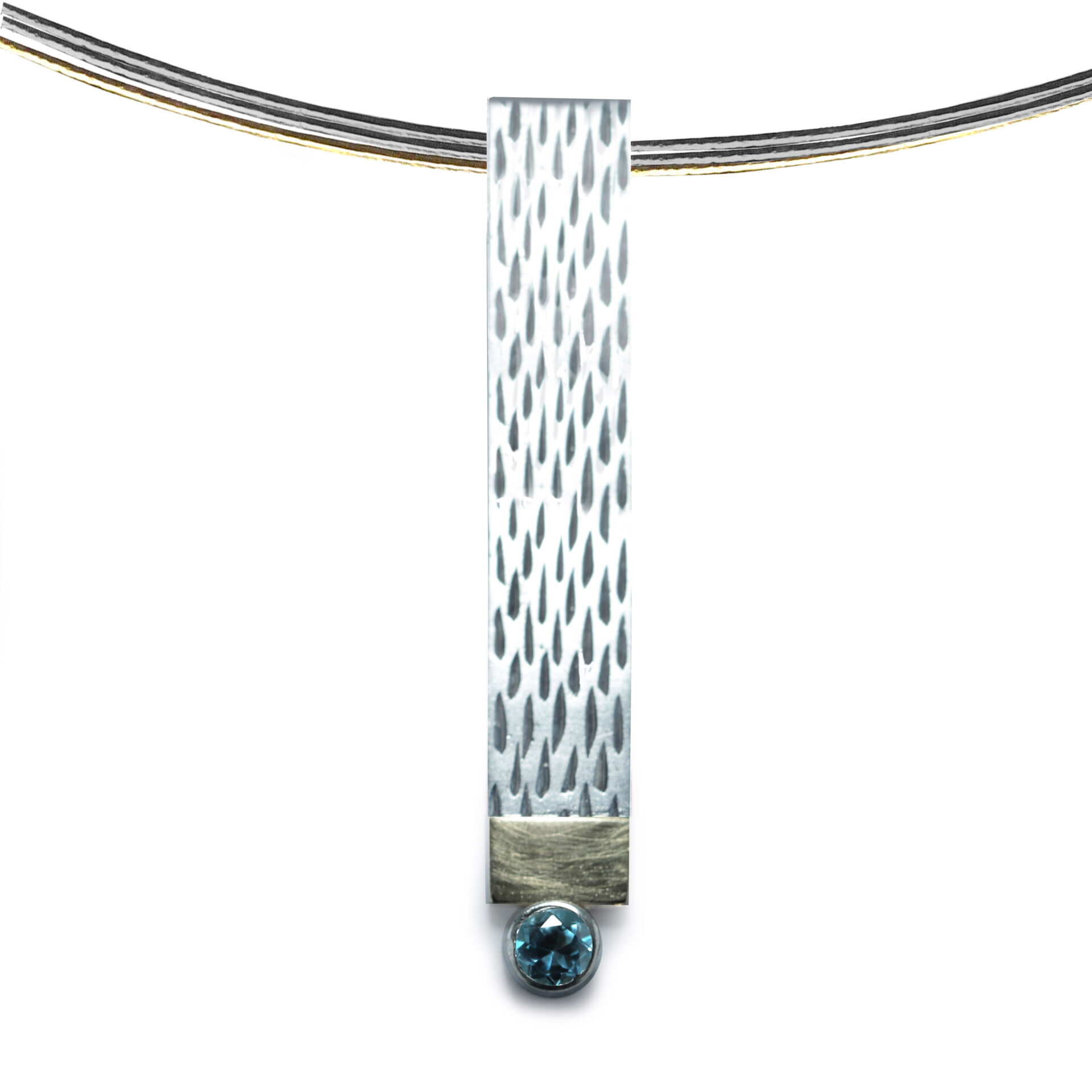 Penjoll de plata en forma de rectangle vertical d’uns 0.7 x 4.5 cm d’amplada, amb acabat amb ratlles. En la part inferior , linea d’or groc de 18 kts mate ratllada, i boca amb pedra de 4mm de diametre. Cordó no inclós.