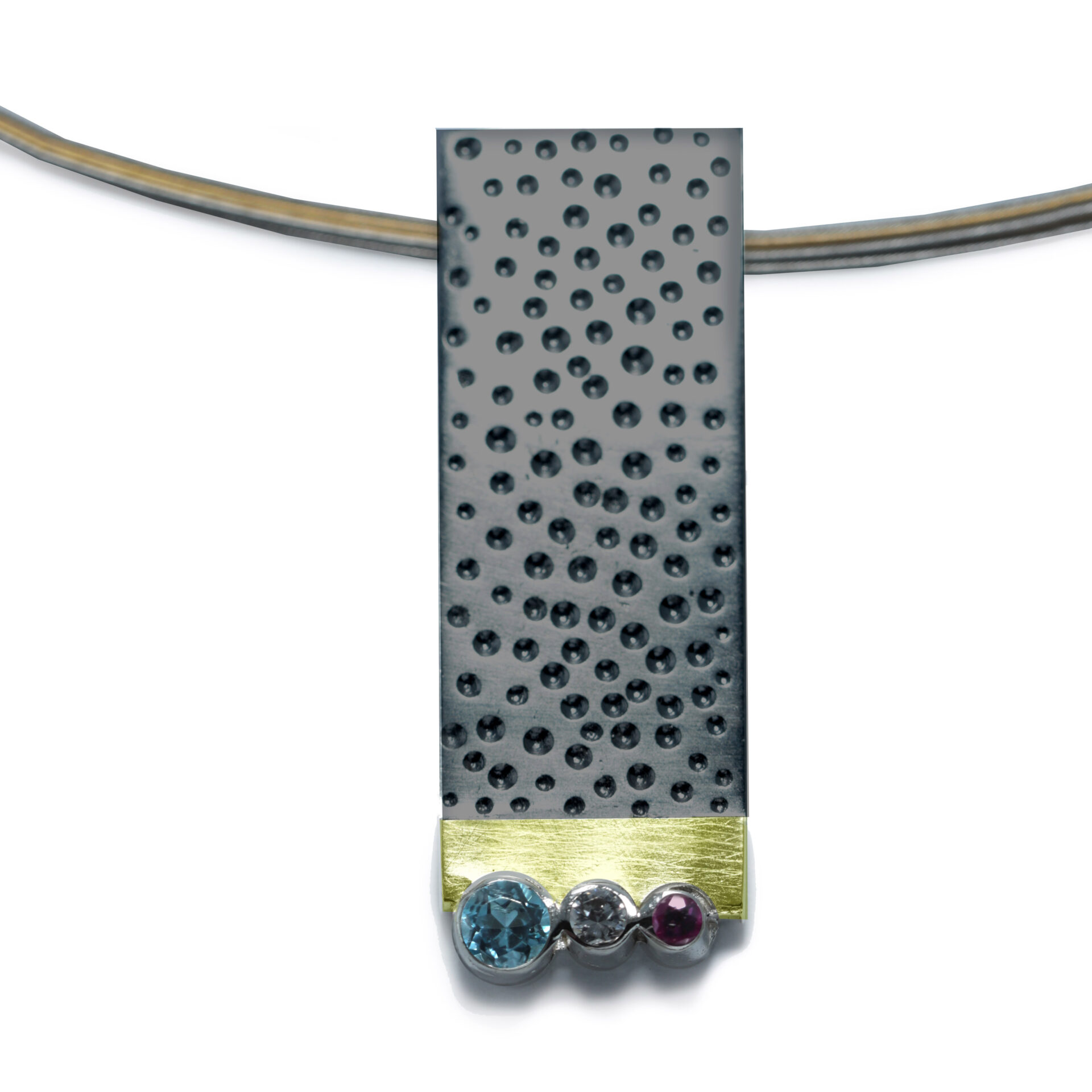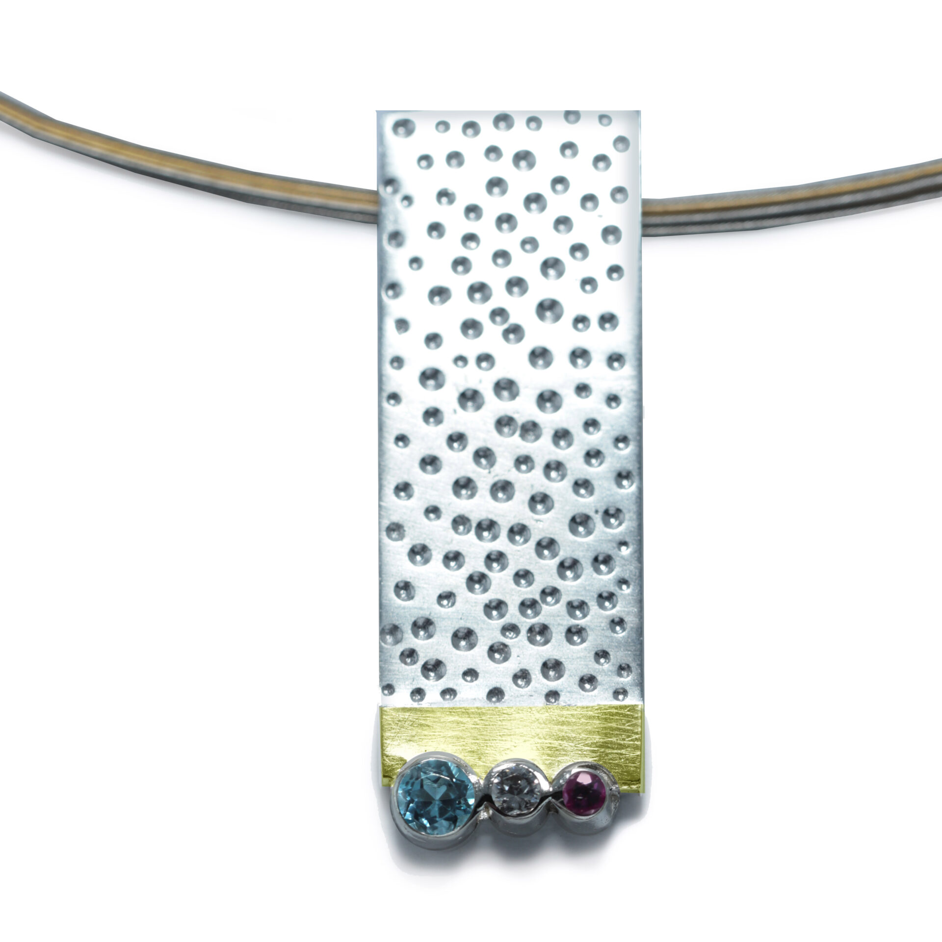 Penjoll de plata en forma de rectangle vertical d’uns 1.4 x 4 cm d’amplada, amb acabat amb punts. En la part inferior , linea d’or groc de 18 kts mate ratllada, i 3 boques amb topaç de 4mm de diametre, circonita de 2.5mm i granat de 2mm. Cordó no inclós.