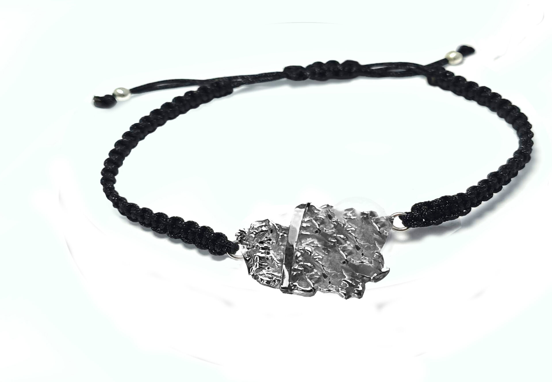 Polsera de plata, formada per peça d’uns 2 cm. de diametre, en forma de textura refossa, en plata blanca o ennegrida i parts brillants, tira de plata brillant inclinada amb o sense or de 18 kilats i amb o sense perla blanca d’uns 0.8cm de diametre. Macramé amb cordó negra i nus ajustable.