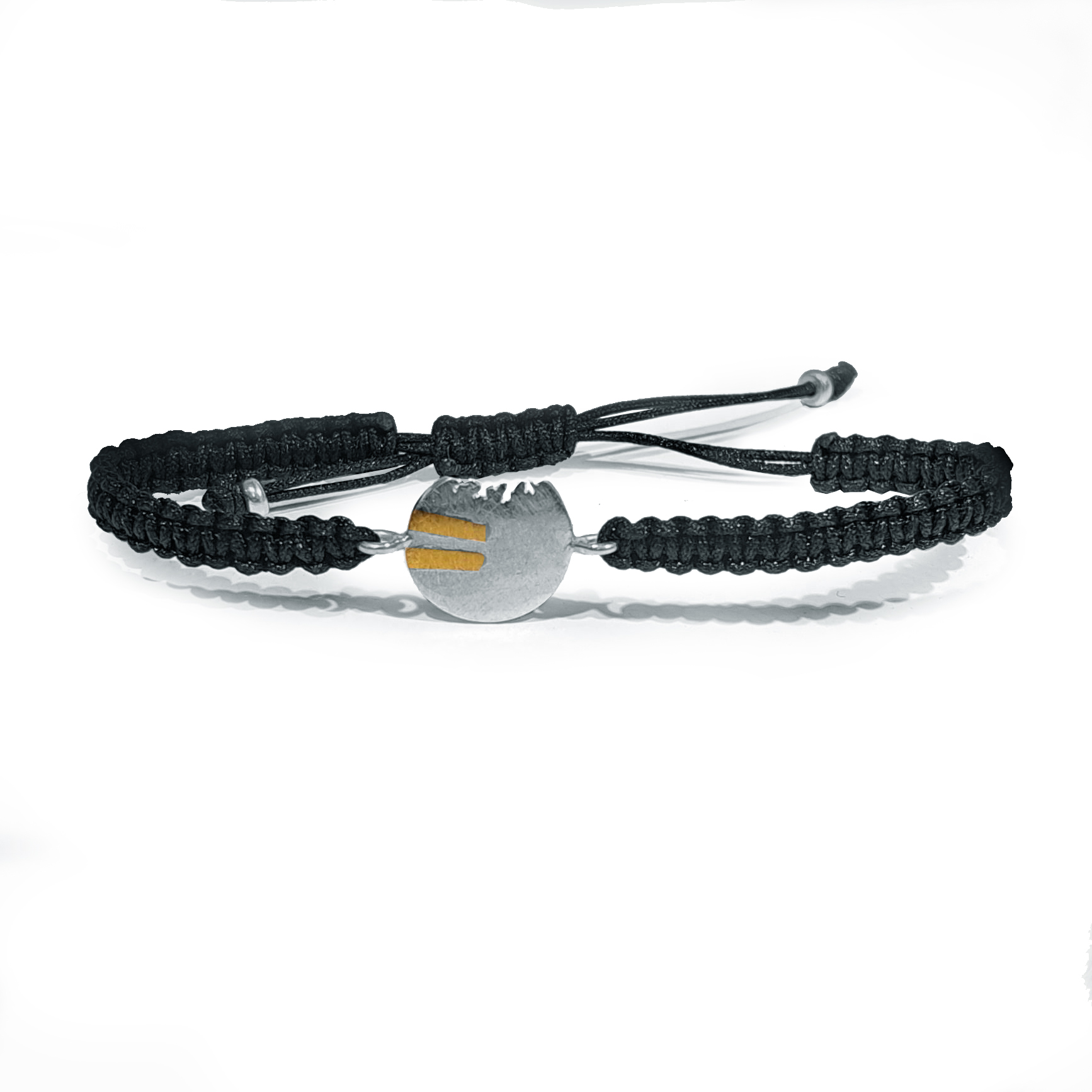 Polsera de plata i or de 24k, d’uns 1,2 cm. de diàmetre, en forma de rodona amb mosegada i 2 lineas d’or Kumm Boo. Acabat mate ratllat o polit. Cordó macramé amb nus ajustable.