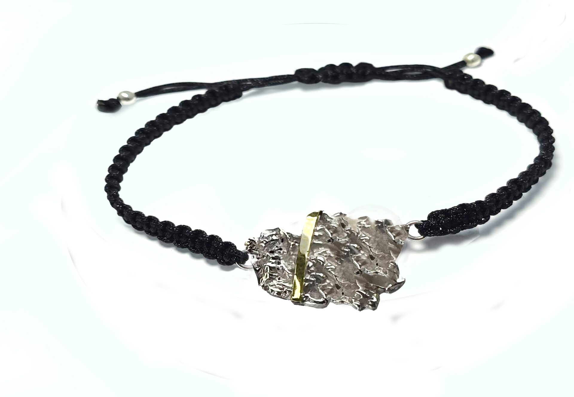 Polsera de plata, formada per peça d’uns 2 cm. de diametre, en forma de textura refossa, en plata blanca o ennegrida i parts brillants,i tira de plata amb plantxa d’or groc de 18 kilats inclinada, amb o sense perla. Macramé amb cordó negra i nus ajustable.