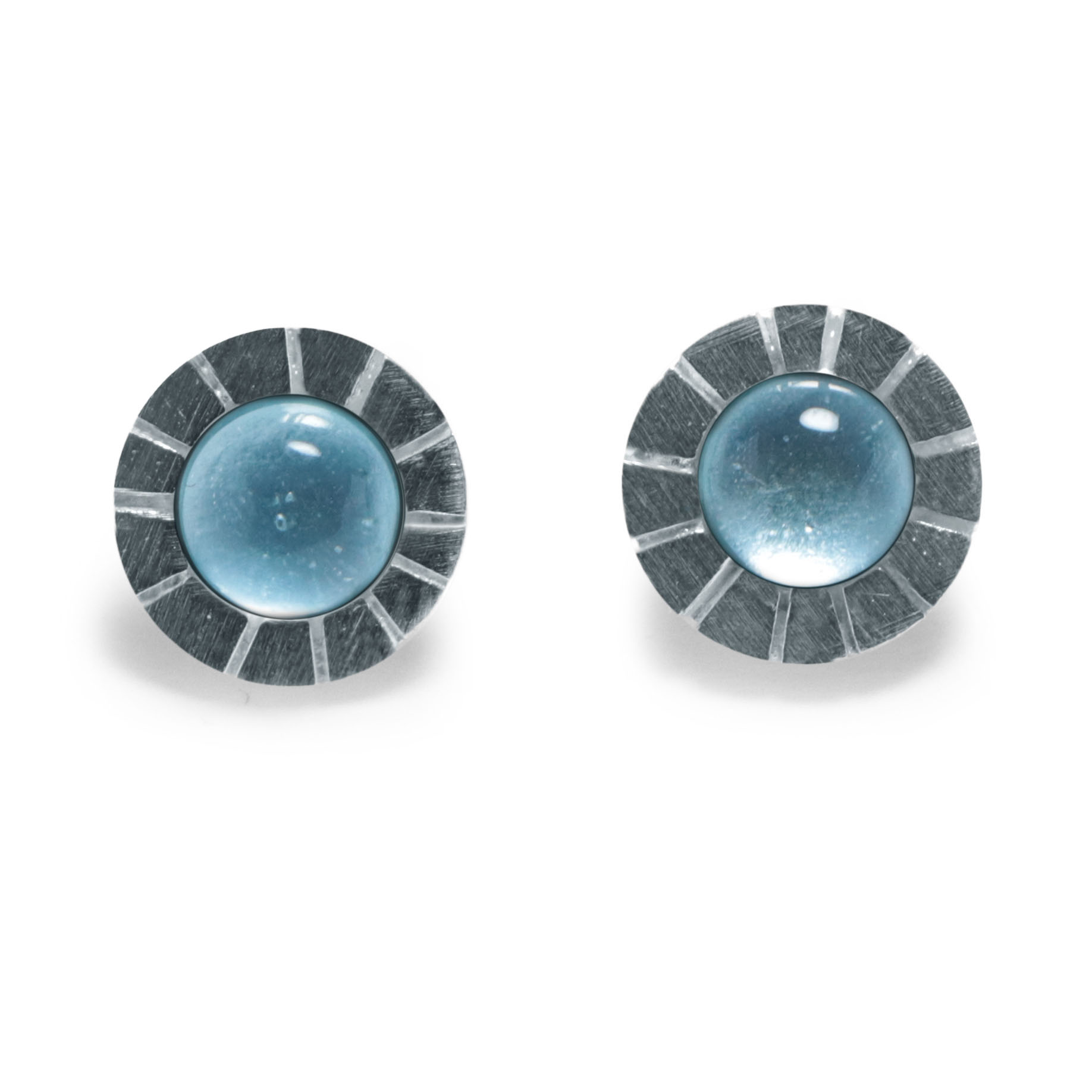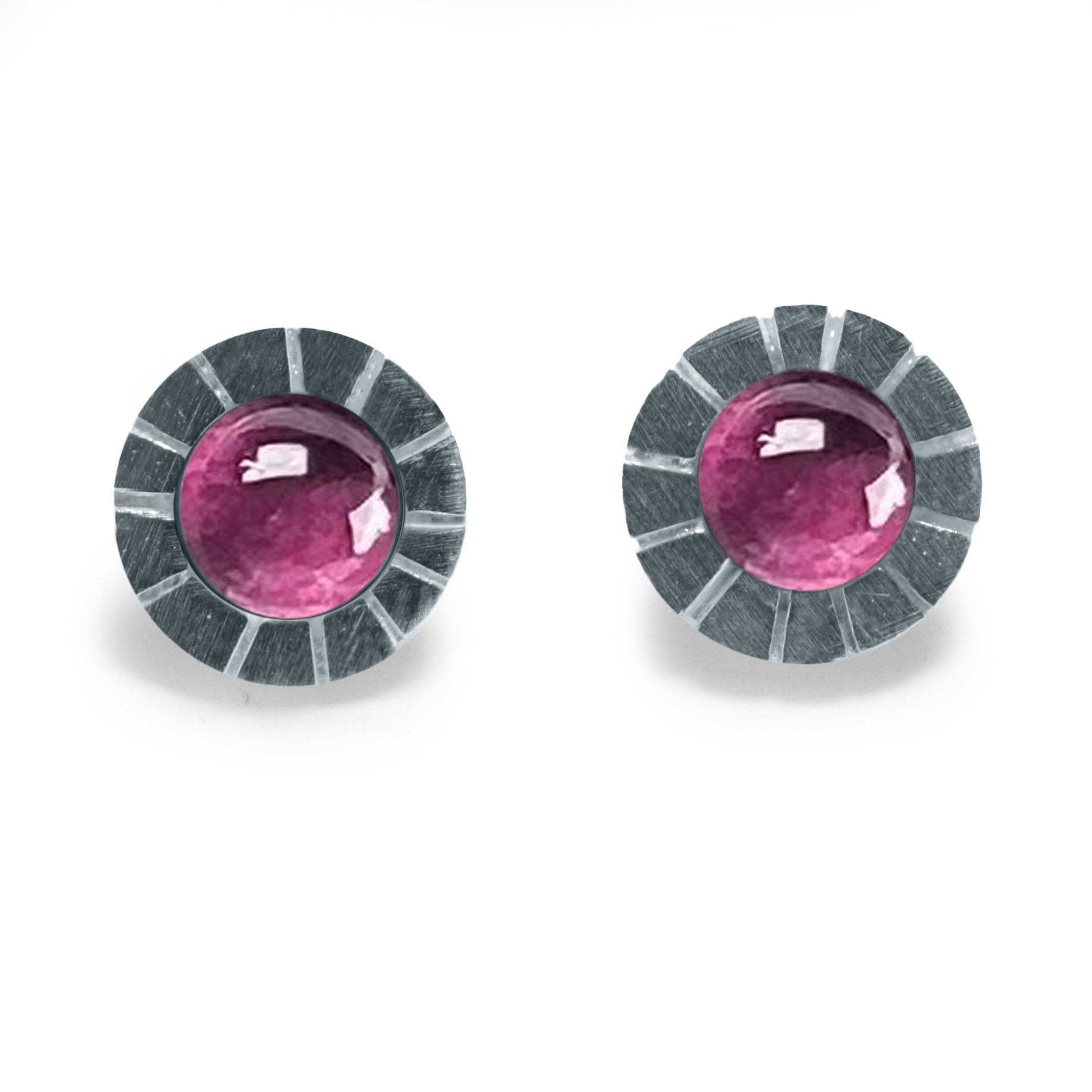 Arracada de la col.lecció ROMA, rodona de plata d’uns 0.8cm de diametre amb radis serrats, amb pedra color en forma rodona cabuixó de 0.5cm de diametre.Tanca pressió de plata.