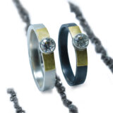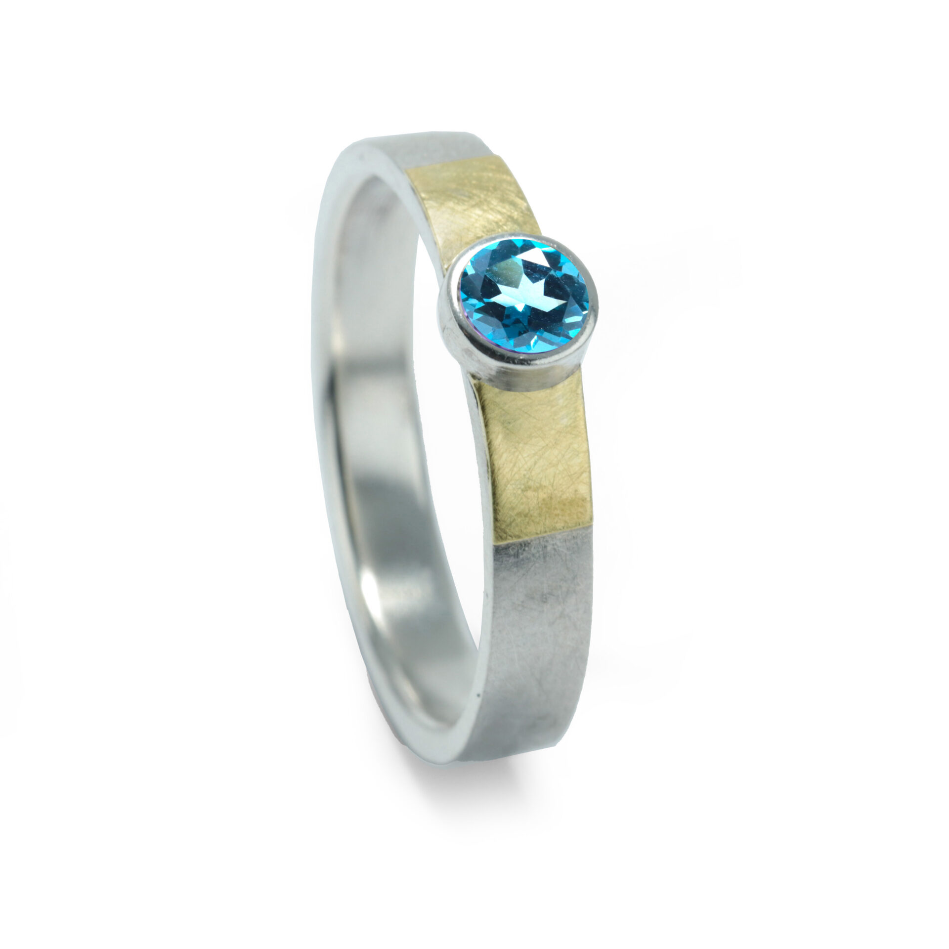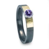 Anell de plata amb fil rectangular d’uns 3.5mm d’amplada, amb acabat lliç. En la part central, boca amb pedra de 4mm de diametre, amb rectangle a cada costat d’or groc de 18 kilats.